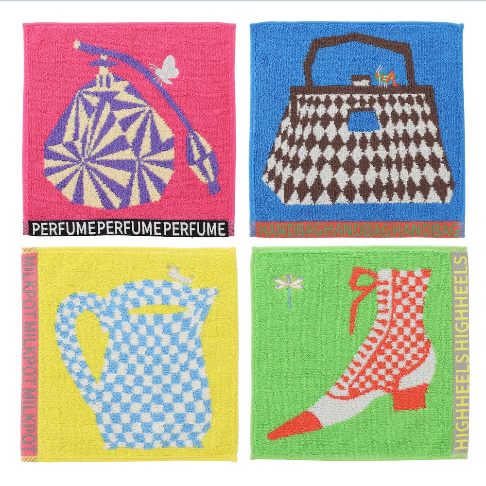 FAVORITE(フェイバリット)シリーズ。香水瓶、バッグ、ミルクポット、ヒールブーツをモチーフにしたミニタオルです。