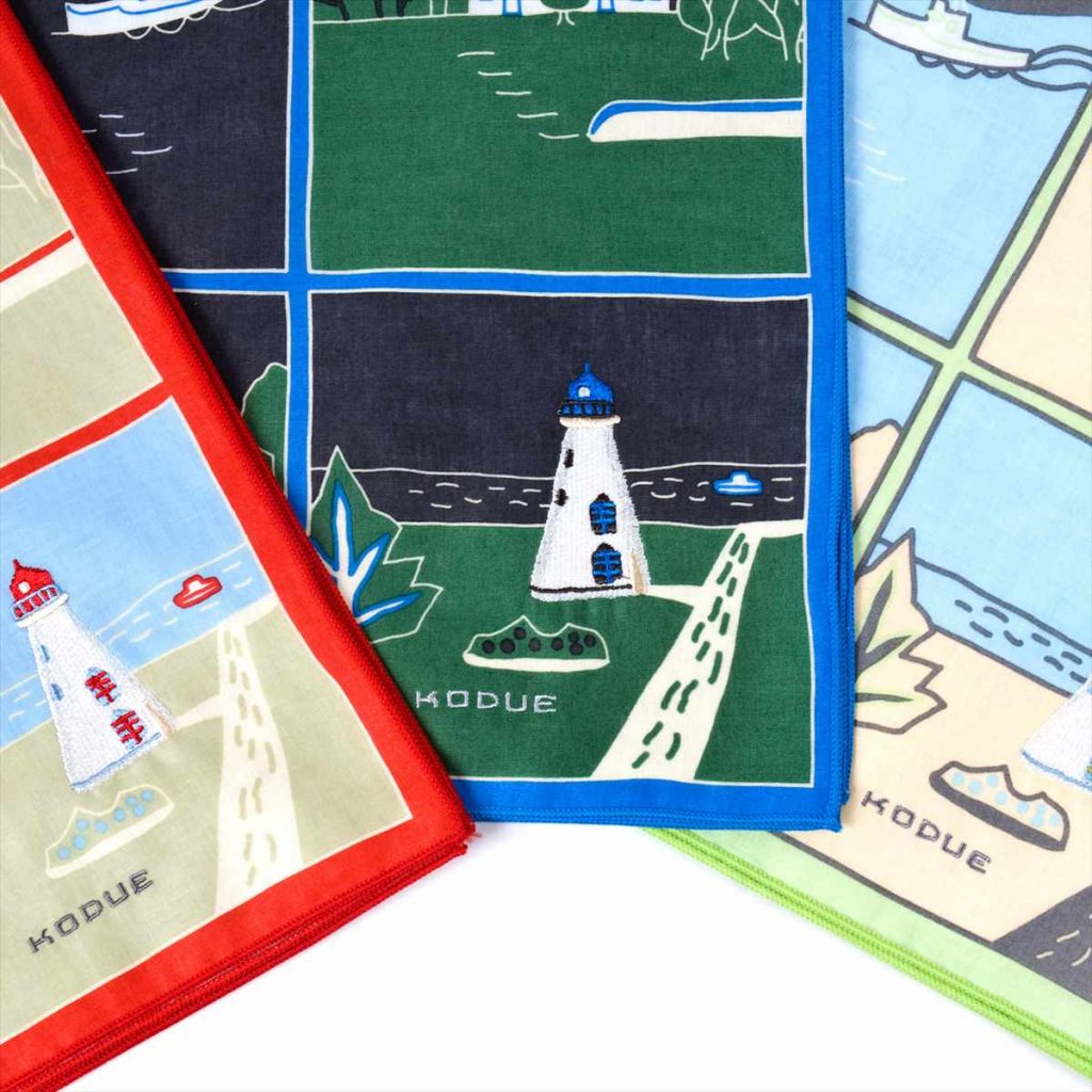 小时候住过的房子,记忆中的大海和高山。手帕描绘了一幅悠闲的乡村风景画。绣有徽标和灯塔。每次使用,您都会感到心旷神怡。